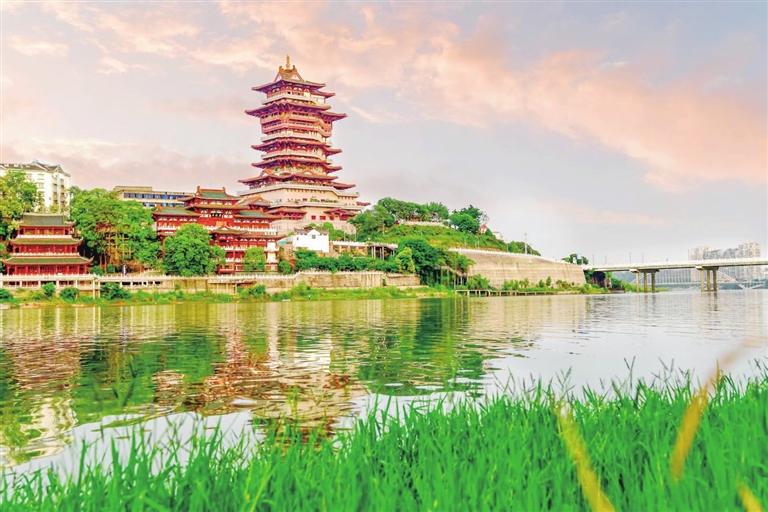 “云架重樓出郡城,虹梁雅韻仲宣情”大意是,越王樓高聳入云,超出城郭之上;彩虹般壯美的梁柱與雅致氣韻,觸發(fā)了詩人的抒懷之情。首聯(lián)既展現越王樓的壯麗,又描寫其建筑之美。