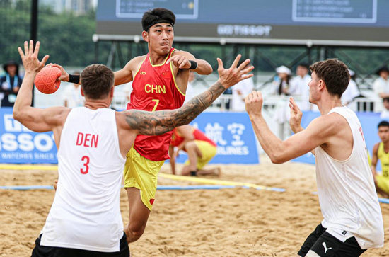 8月11日,中國隊球員任健豪(上)在比賽中進攻。當日,在2025年成都世運會沙灘手球男子第5-8名安慰賽半決賽中,中國隊0比2不敵丹麥隊。新華社記者 劉坤 攝