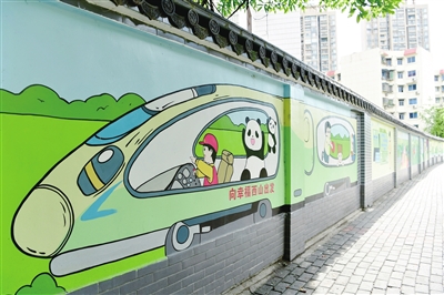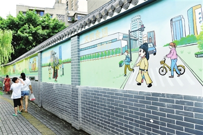 鄰里互助、光盤(pán)行動(dòng)、文明遛犬、節(jié)約水電、移風(fēng)易俗、消防安全、文明旅游、垃圾分類……近日,記者在涪城區(qū)宇虹北街西二巷平政河畔看到,河岸一側(cè)長(zhǎng)約400米的圍墻上,描繪著數(shù)十幅色彩亮麗的主題彩繪組成的“文明號(hào)高速動(dòng)車(chē)”。每段墻繪即是一堂文明課,內(nèi)容豐富,生動(dòng)有趣,兼具藝術(shù)美感,與古樸青灰色調(diào)的滴水瓦、墻體相映成景,成為居民身邊一道靚麗的文明風(fēng)景線。 (記者 王勇 攝影報(bào)道)