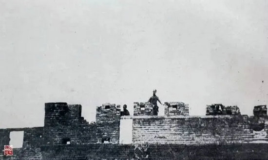 在七七事變發(fā)生后拍攝的第29軍將士在宛平縣城上監(jiān)視日軍的照片。照片上可見城墻上彈痕累累,殘破不全,顯示宛平城剛剛遭受過(guò)日軍十分猛烈的炮擊。新華社發(fā)