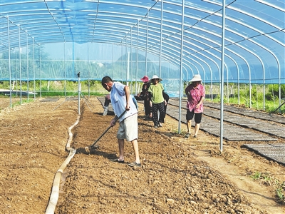 鹽亭縣玉龍鎮(zhèn)梓江村蔬菜基地大棚內(nèi),村民整理苗床