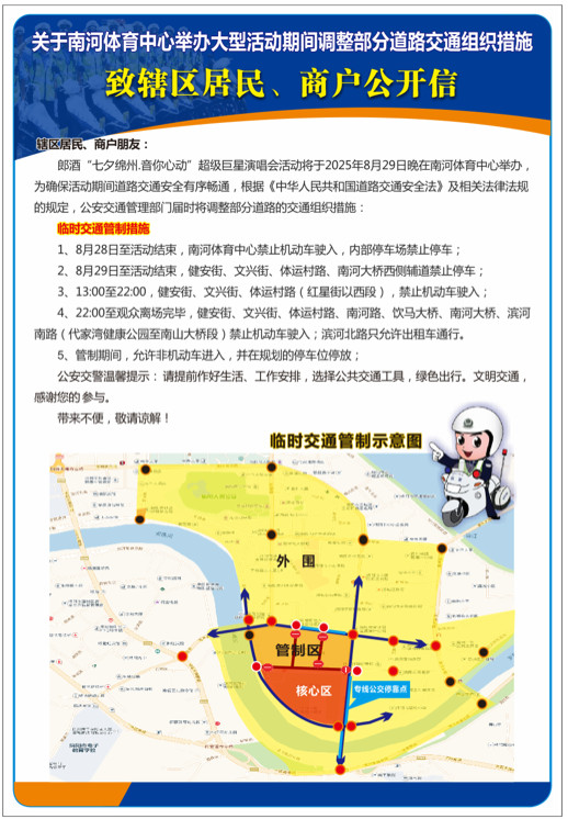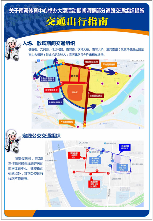 (三)22:00至觀眾離場完畢,健安街、文興街、體運村路、南河路、飲馬大橋、南河大橋、濱河南路(代家灣健康公園至南山大橋段)禁止機動車駛?cè)?;濱河北路只允許出租車通行。
