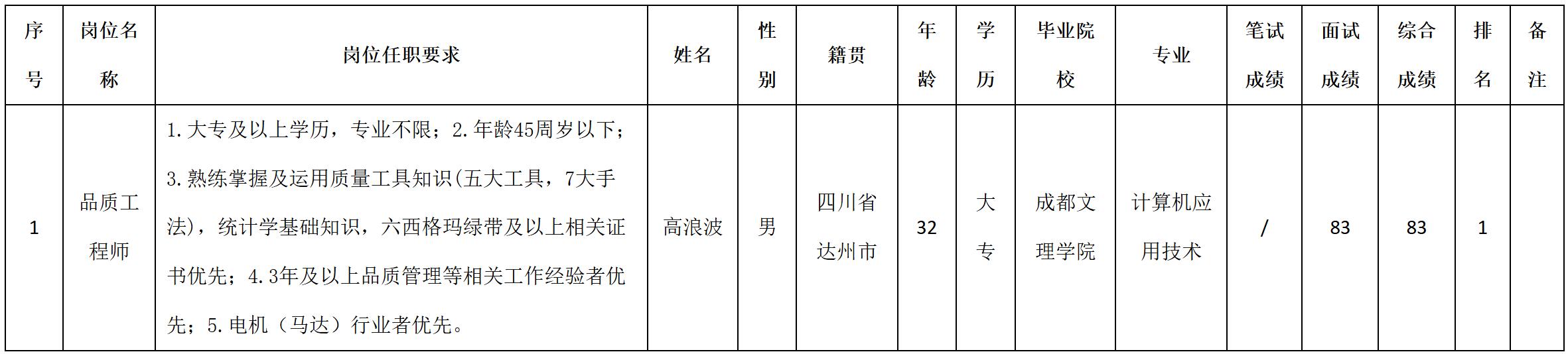 四川安和精密電子電器股份有限公司關(guān)于招聘品質(zhì)工程師測試成績的公示