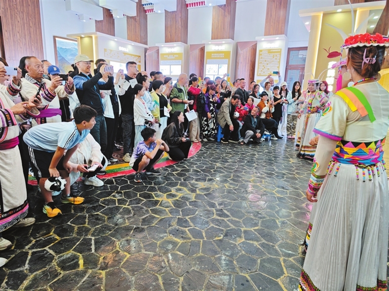 隨著白馬藏族傳統(tǒng)舞蹈熱情上演,歡快的節(jié)奏與優(yōu)美的舞姿迅速點燃全場氣氛,讓在場觀眾沉浸式感受到這一古老民族文化的獨特魅力。在知識宣講環(huán)節(jié),講解員以白馬十八寨的歷史脈絡(luò)為主線,從傳統(tǒng)節(jié)慶到服飾、飲食等人文風(fēng)俗,引導(dǎo)公眾在感受民族文化魅力的同時,主動踐行文明旅游理念,切實將文化尊重與環(huán)境愛護的意識融入旅游全過程,營造安全舒心的平武旅游環(huán)境。