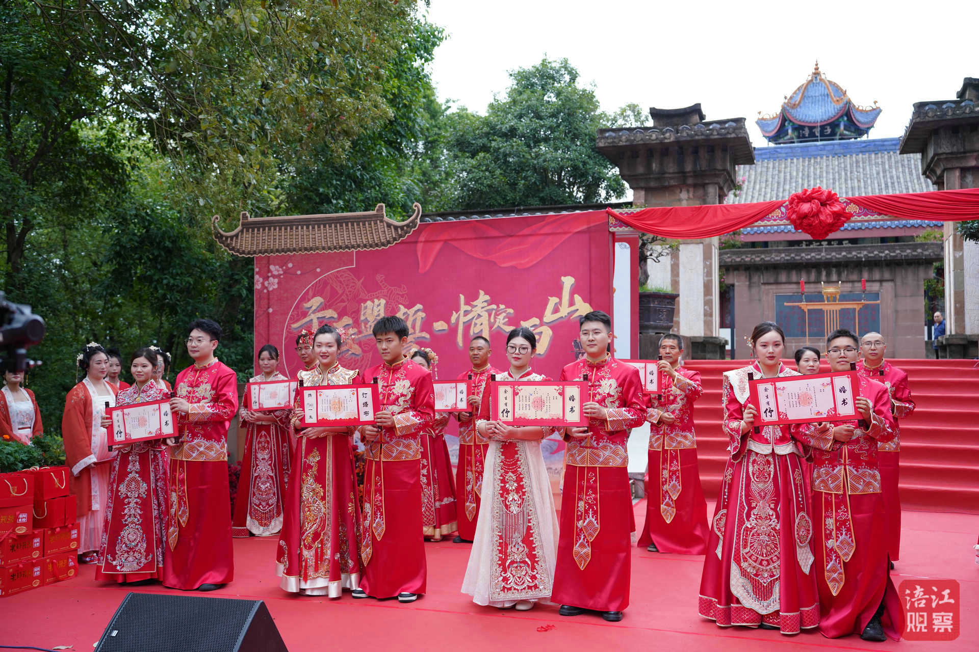 撒喜豆、沃盥禮、合巹禮、結(jié)發(fā)禮……8月28日,在綿陽市西山公園子云亭下,“子云盟誓·情定西山”紅色背景板鮮艷奪目,20對新人以簡約而莊重的儀式,踐行婚俗新風(fēng),開啟婚姻幸福新篇章。