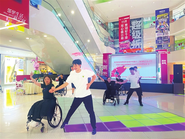 綿陽(yáng)新聞網(wǎng)訊 近日,綿陽(yáng)王府井百貨商場(chǎng)一樓,音樂(lè)流淌間,輪椅舞蹈隊(duì)長(zhǎng)楊晉輕推輪圈,身下的輪椅仿佛化作靈動(dòng)的舞鞋,她舒展雙臂劃出優(yōu)美弧線,與隊(duì)員們?cè)谖枧_(tái)中央共同綻放奪目光彩——這是綿陽(yáng)輪椅舞蹈隊(duì)備戰(zhàn)全國(guó)賽事的日常訓(xùn)練場(chǎng)景。
