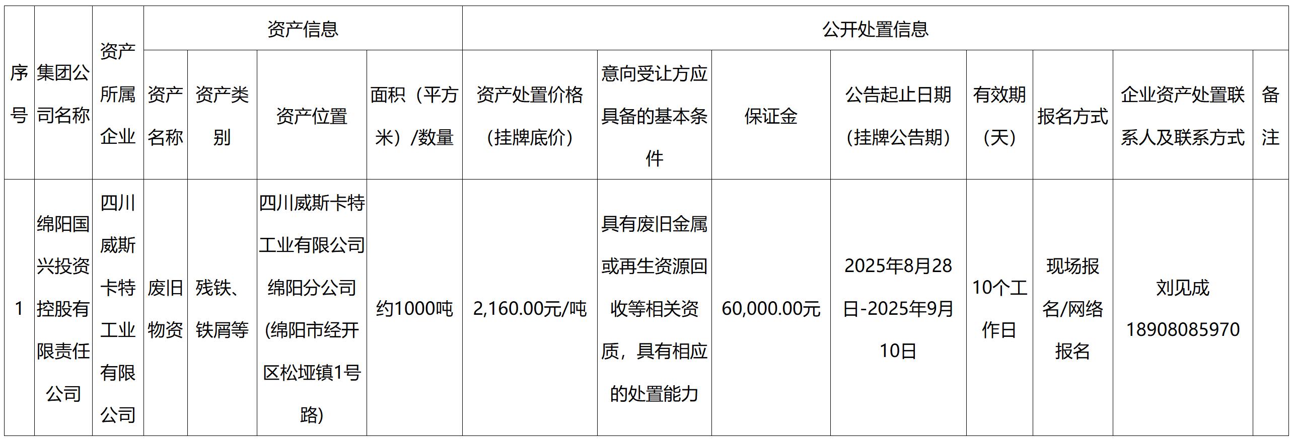 綿陽國興投資控股有限責任公司資產(chǎn)處置公告