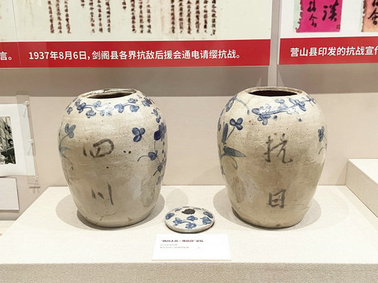 “偉大勝利川渝貢獻(xiàn)——紀(jì)念中國(guó)人民抗日戰(zhàn)爭(zhēng)暨世界反法西斯戰(zhàn)爭(zhēng)勝利80周年專題展”中展出的“四川人民一致抗日”瓷壇。李雨心 攝