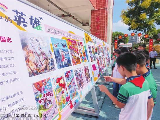 游仙區(qū)鶴林小學學生在全民國防教育主題活動優(yōu)秀繪畫作品展展板前仔細觀看