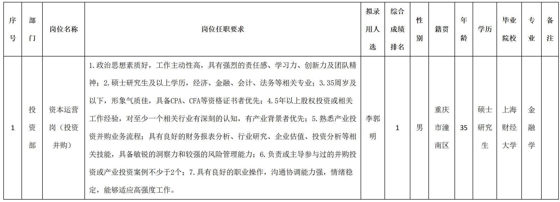 根據(jù)四川九洲創(chuàng)業(yè)投資有限責(zé)任公司發(fā)布的招聘公告及招聘相關(guān)規(guī)定,經(jīng)筆試、面試、考察、體檢等程序,擬錄用李郭明同志到四川九洲創(chuàng)業(yè)投資有限責(zé)任公司工作,現(xiàn)予以公示,具體情況如下: