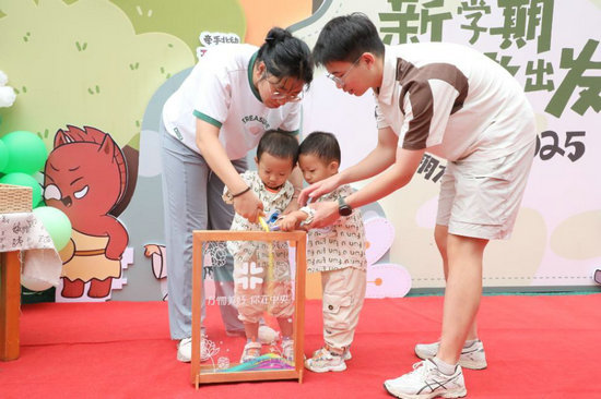 “浪浪山”外有藍(lán)天,而勇氣,是孩子手中的第一把鑰匙。紅毯鋪路,氣球?yàn)殚T(mén),幼兒園以充滿童趣和儀式感的環(huán)境,溫柔地接納每一個(gè)略顯忐忑卻又滿懷好奇的小小人兒。他們牽著爸爸媽媽的手,一步一步,走進(jìn)班級(jí),認(rèn)識(shí)自己的小床、水杯,完成與“新家”的第一次接觸——這看似簡(jiǎn)單的每一步,都是翻越“浪浪山”的扎實(shí)腳印。