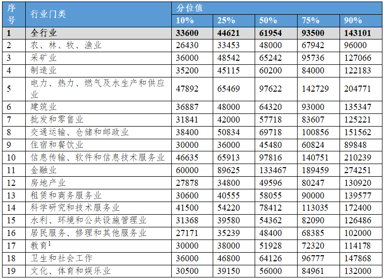 從職業(yè)中類工資價位來看,中位數(shù)排名前五的職業(yè)是金融服務(wù)人員,信息傳輸、軟件和信息技術(shù)服務(wù)業(yè)人員,企業(yè)單位負(fù)責(zé)人,電力、燃?xì)饧八?yīng)服務(wù)人員,科學(xué)研究人員,分別為123660元/年、98000元/年、94420元/年、90071元/年、90000元/年。