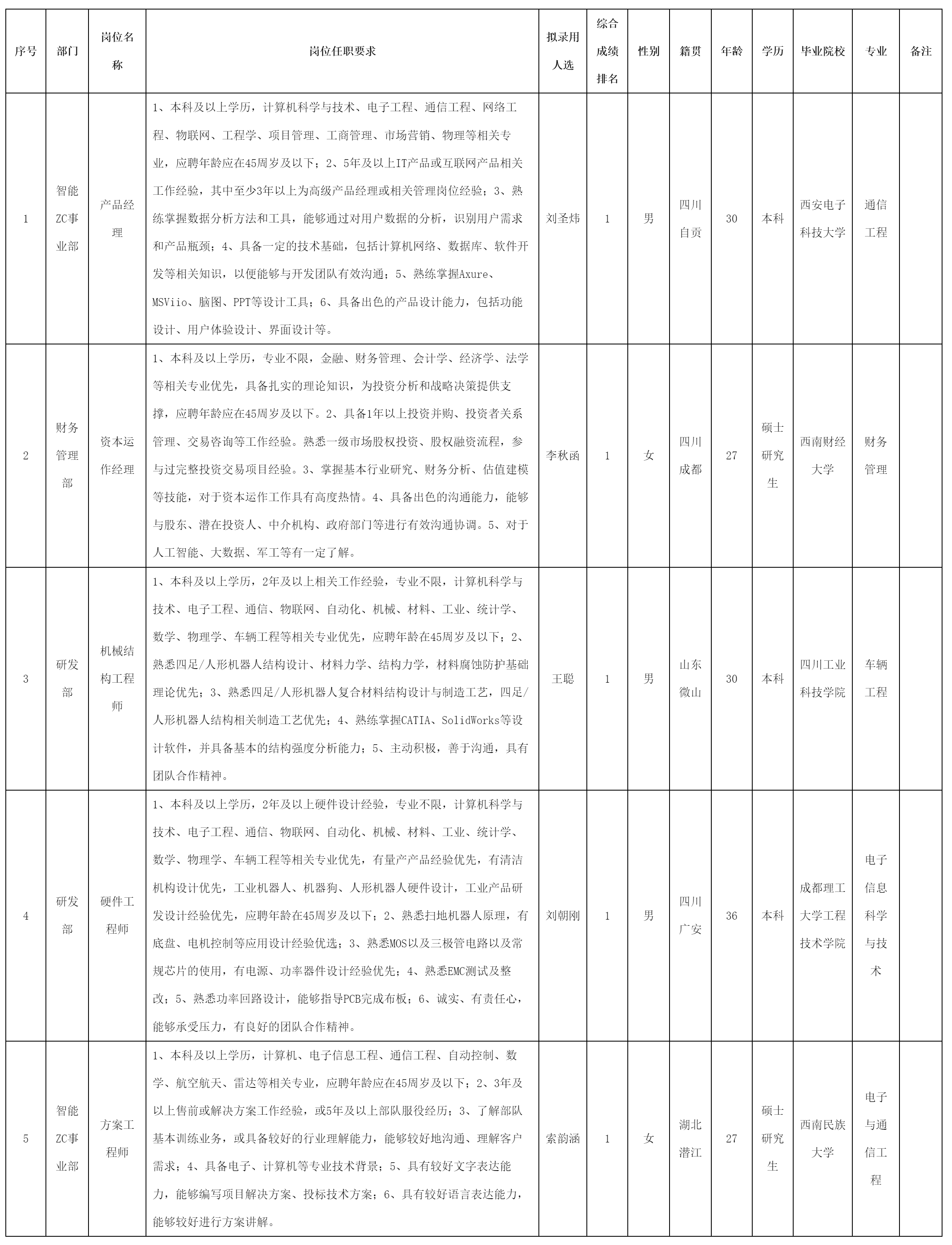 根據(jù)四川九洲投資控股集團有限公司軟件與數(shù)據(jù)智能軍團發(fā)布的招聘公告及招聘相關(guān)規(guī)定,經(jīng)筆試、面試、考察、體檢等程序,擬錄用劉圣煒等5名同志到四川九洲投資控股集團有限公司軟件與數(shù)據(jù)智能軍團工作,現(xiàn)予以公示,具體情況如下: