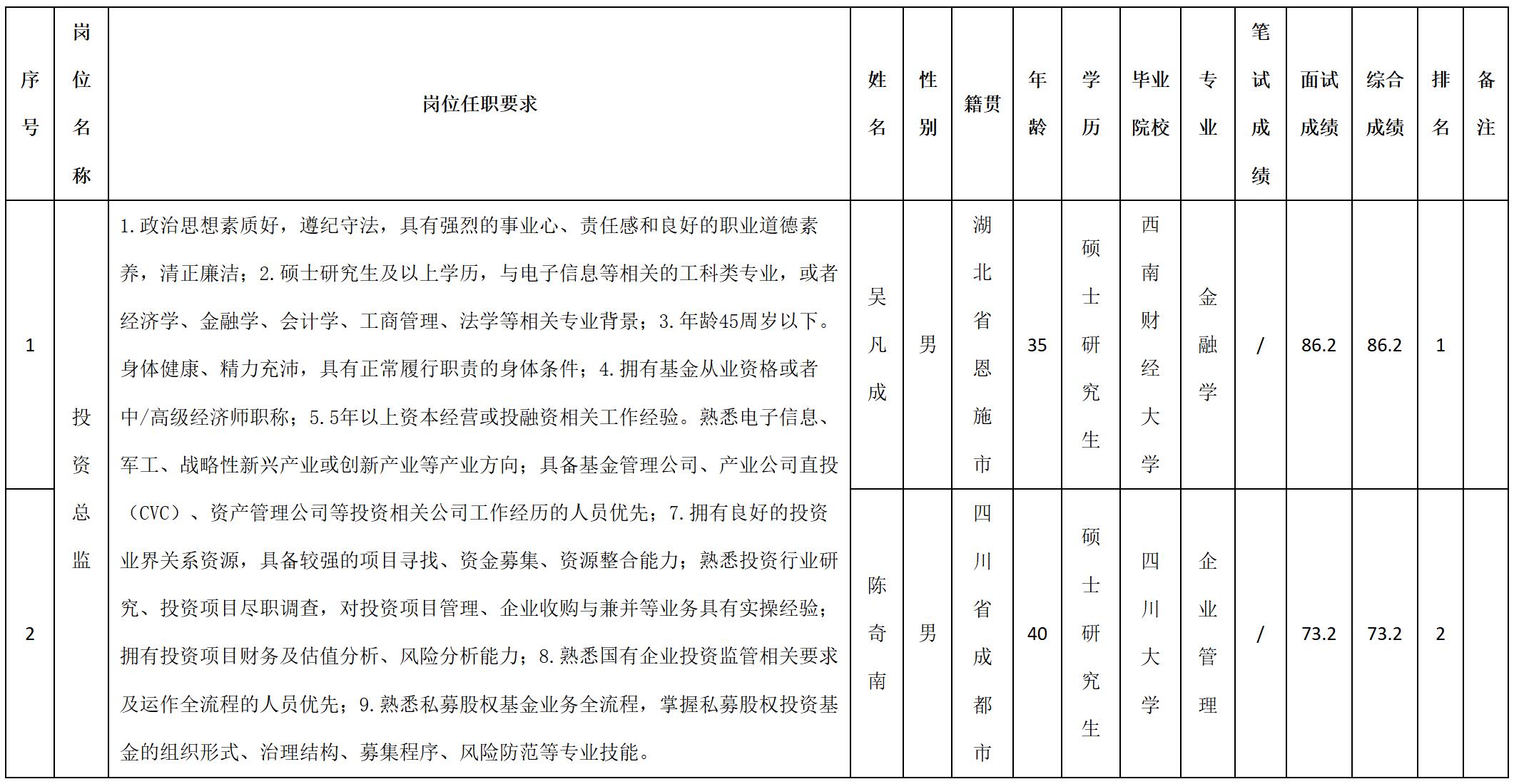 根據(jù)四川九洲君合私募基金管理有限公司發(fā)布的招聘公告及招聘相關(guān)規(guī)定,經(jīng)筆試、面試等程序,現(xiàn)將筆試(面試)成績予以公示。