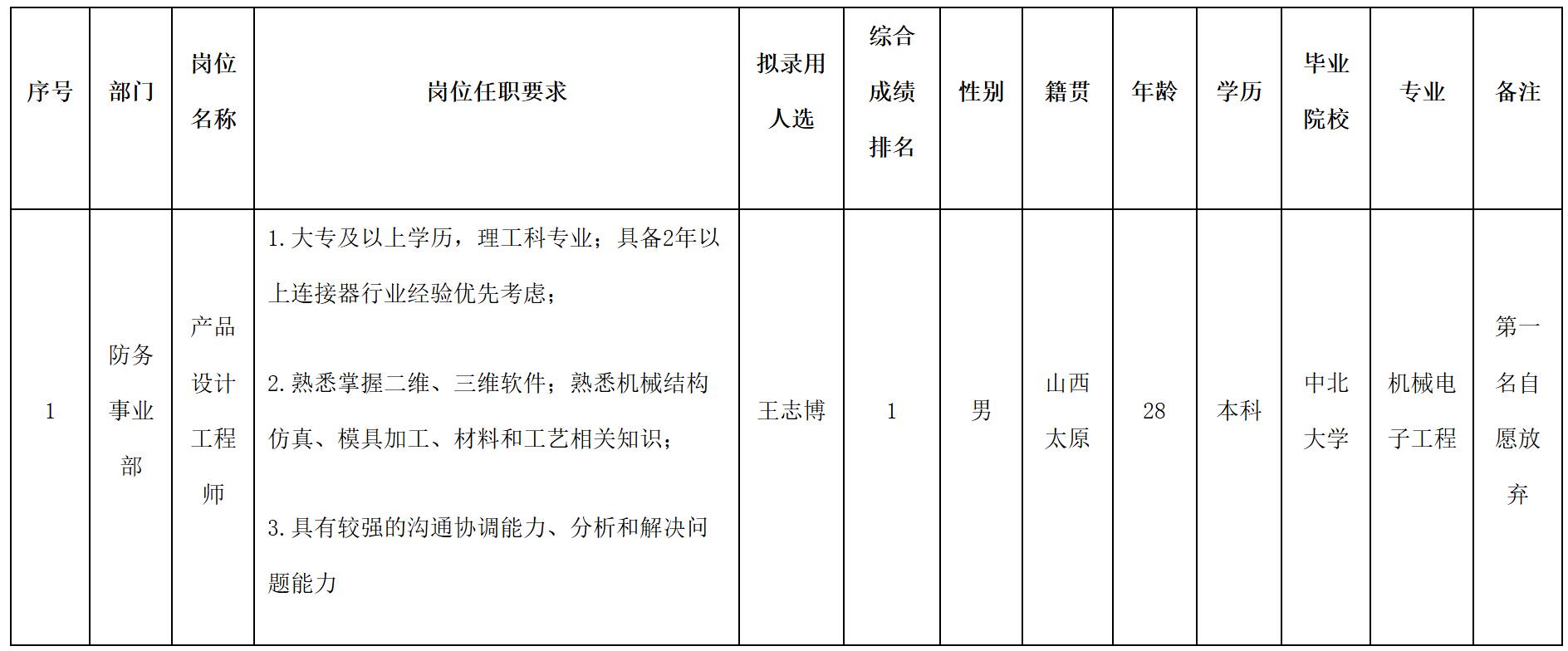 根據(jù)四川華豐科技股份有限公司發(fā)布的招聘公告及招聘相關規(guī)定,經(jīng)筆試、面試、考察、體檢等程序,擬錄用王志博同志到四川華豐科技股份有限公司工作,現(xiàn)予以公示,具體情況如下: