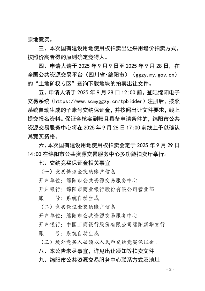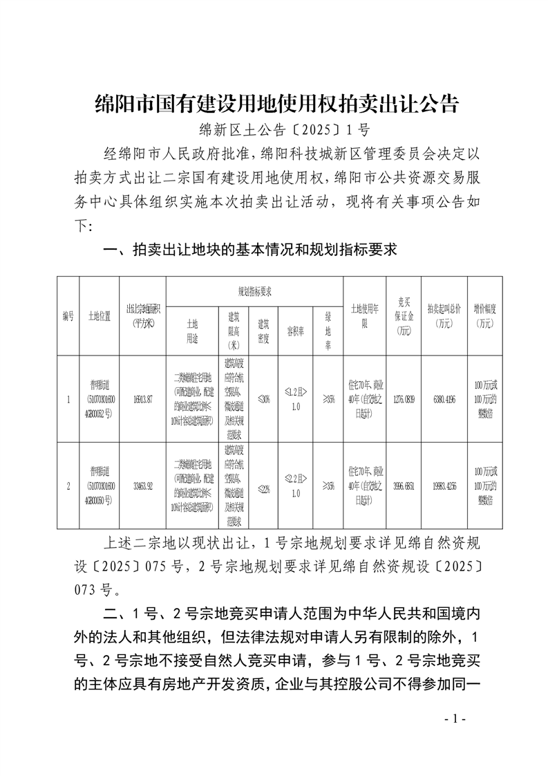 綿陽(yáng)市國(guó)有建設(shè)用地使用權(quán)拍賣出讓公告(綿新區(qū)土公告〔2025〕1號(hào))