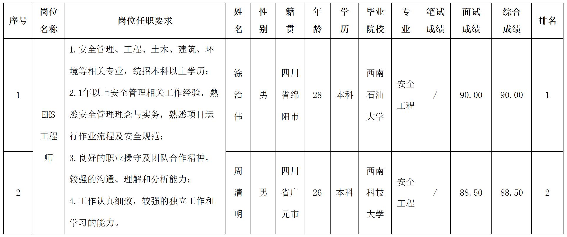 根據(jù)四川波鴻實(shí)業(yè)有限公司發(fā)布的招聘公告及招聘相關(guān)規(guī)定,經(jīng)面試等程序,現(xiàn)將面試成績予以公示。