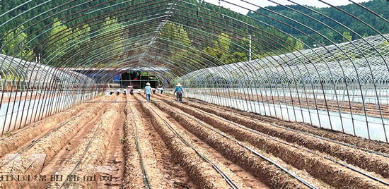 蜀美家庭農(nóng)場(chǎng)大棚內(nèi),工人們正在起壟移栽