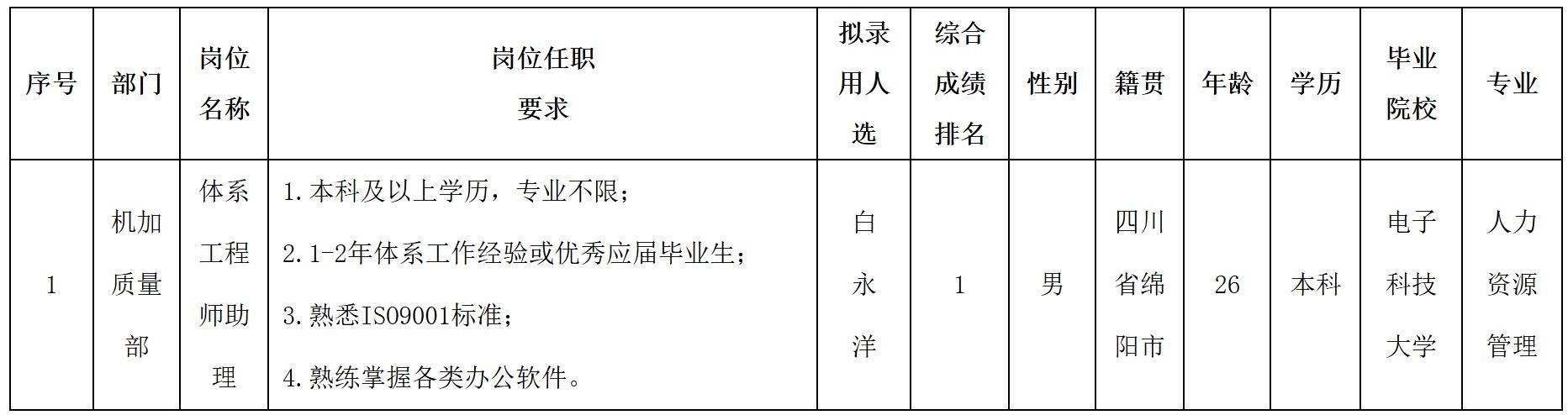 根據(jù)四川波鴻實(shí)業(yè)有限公司發(fā)布的招聘公告及招聘相關(guān)規(guī)定,經(jīng)面試、體檢等程序,擬錄用白永洋同志到威斯卡特(綿陽(yáng))汽車零部件制造有限公司工作,現(xiàn)予以公示,具體情況如下: