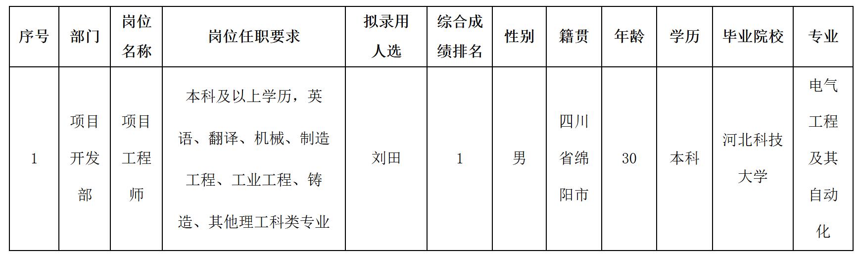 根據(jù)四川波鴻實(shí)業(yè)有限公司發(fā)布的招聘公告及招聘相關(guān)規(guī)定,經(jīng)面試、體檢等程序,擬錄用劉田同志到四川威斯卡特工業(yè)有限公司綿陽分公司工作,現(xiàn)予以公示,具體情況如下: