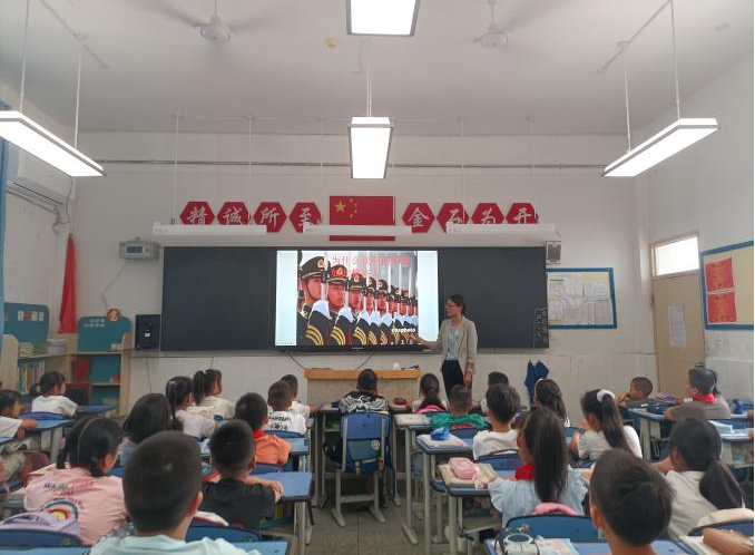 班主任還引導同學們回顧了開學思政第一課中的中國抗戰(zhàn)史,讓同學們結(jié)合閱兵儀式談談自己的感想。孩子們積極舉手發(fā)言,有的同學說:“看到閱兵式上的強大陣容,我想到了今天的幸福生活是抗戰(zhàn)先烈們的英勇犧牲換來的,真是來之不易,一定要倍加珍惜。”還有的同學表示:“抗戰(zhàn)史是一段屈辱與抗爭的歷史,閱兵則展示了我們國家的崛起,我長大了也要成為一名戰(zhàn)士。”