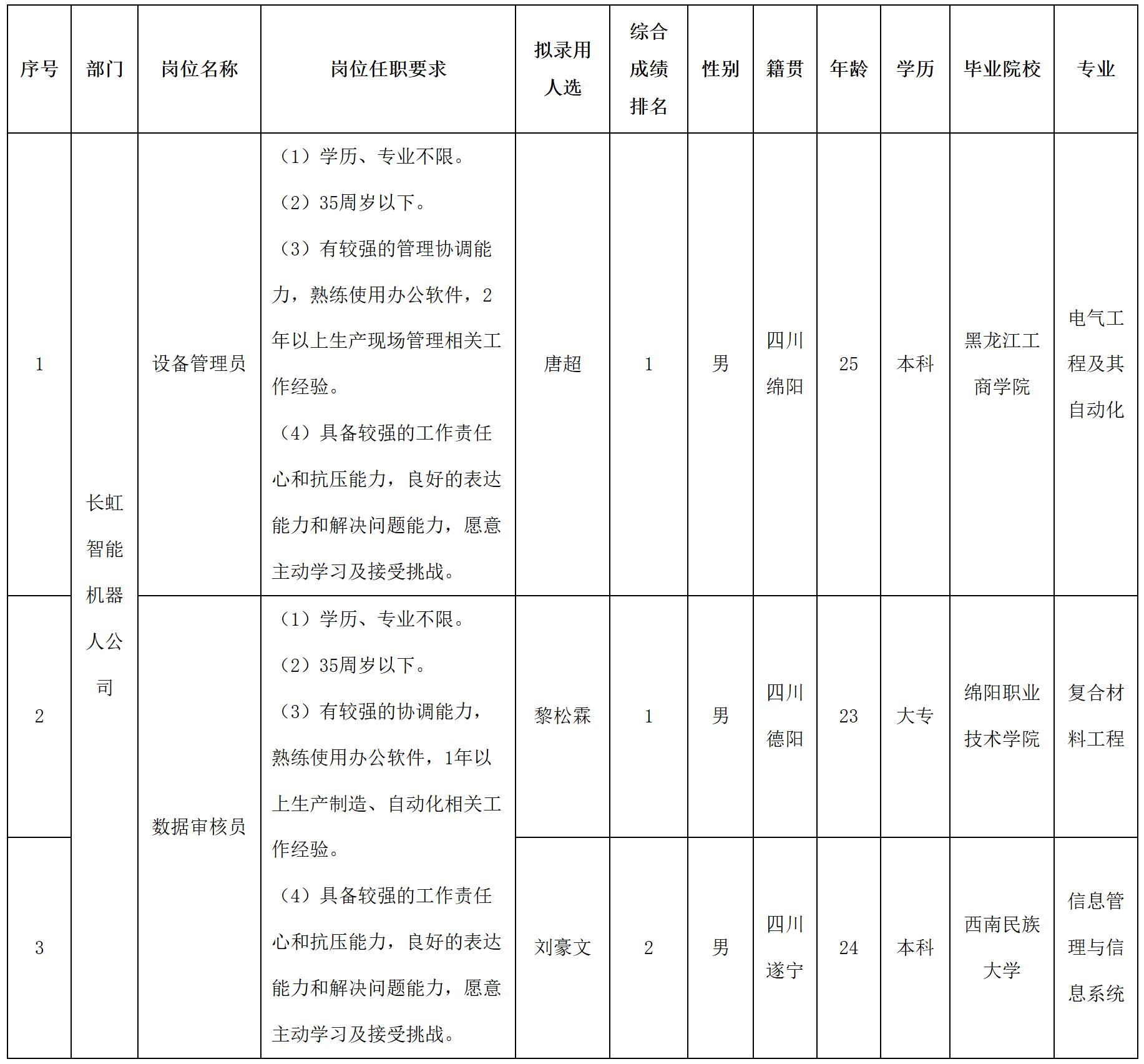 根據(jù)四川長虹虹微科技有限公司發(fā)布的招聘公告及招聘相關(guān)規(guī)定,經(jīng)面試,擬錄用唐超、黎松霖、劉豪文同志到公司工作,現(xiàn)予以公示,具體情況如下: