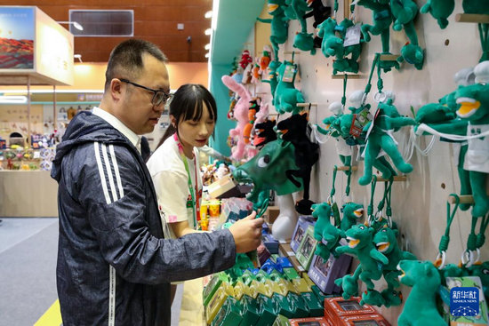 9月21日,與會(huì)嘉賓在第八屆絲綢之路(敦煌)國際文化博覽會(huì)上選購非遺文創(chuàng)產(chǎn)品。