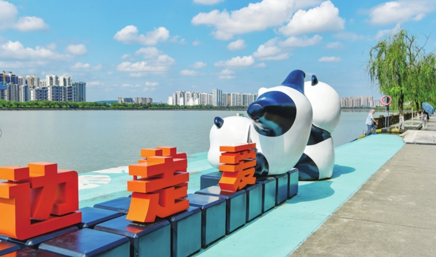 三江河堤上,大熊貓雕塑萌態(tài)可掬。