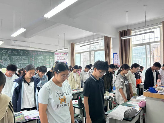 上午10時(shí)整,當(dāng)綿陽(yáng)市防空警報(bào)準(zhǔn)時(shí)響起,全校各班級(jí)瞬間肅靜。全體學(xué)生應(yīng)聲起立,垂首默哀十分鐘。教室里莊重肅穆,唯有窗外的警報(bào)聲叩擊心靈,寄托著師生對(duì)革命先烈的深切哀思與崇高敬意。