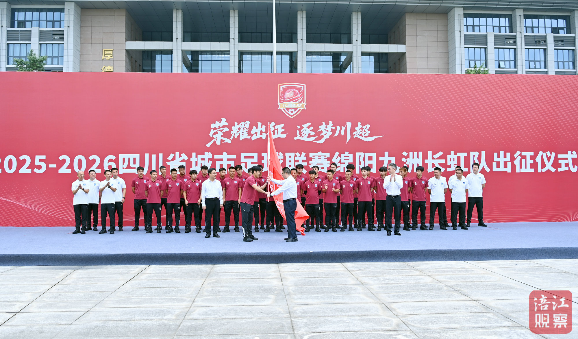 綿陽新聞網訊 9月26日,2025—2026年四川省城市足球聯賽綿陽九洲長虹隊出征儀式在市委黨校舉行,為即將奔赴賽場的全體教練員、運動員加油鼓勁、擂鼓壯行。市委副書記、市長李云向綿陽九洲長虹隊授旗并宣布出征。