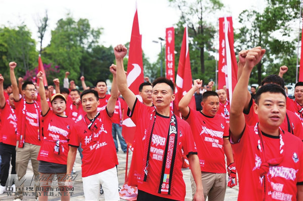 200余名球迷聯(lián)盟成員身著紅色助威服,揮舞隊(duì)旗齊聲高呼“綿陽(yáng)九洲長(zhǎng)虹隊(duì),雄起!雄起!雄起!”