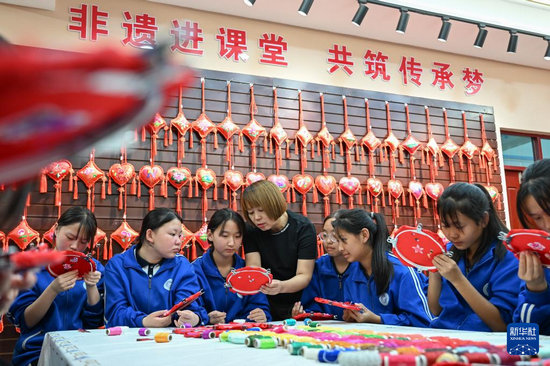 9月26日,內(nèi)蒙古興安盟科右中旗巴彥呼舒第六中學(xué)美術(shù)教師、非遺傳承人吳斯琴(左四)指導(dǎo)學(xué)生刺繡。