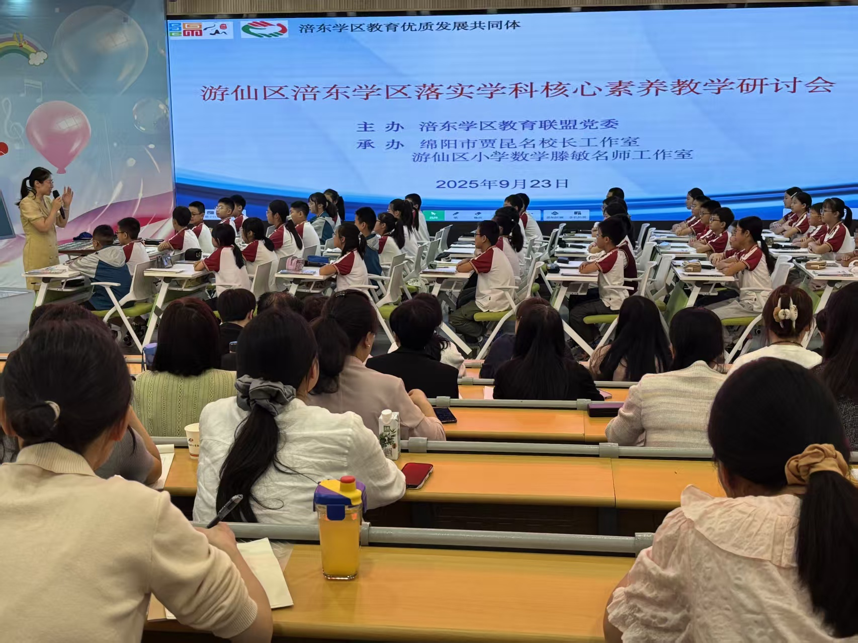 9月23日下午,游仙區(qū)涪東學(xué)區(qū)聯(lián)合“綿陽(yáng)市賈昆名校長(zhǎng)工作室”“游仙區(qū)小學(xué)數(shù)學(xué)滕敏名師工作室”,在綿陽(yáng)市富樂(lè)第二實(shí)驗(yàn)小學(xué)共同開展“落實(shí)學(xué)科核心素養(yǎng)”小學(xué)數(shù)學(xué)教學(xué)研討活動(dòng)。市、區(qū)教研員,涪東學(xué)區(qū)各校數(shù)學(xué)教師代表、兩個(gè)工作室成員及富樂(lè)實(shí)驗(yàn)小學(xué)數(shù)學(xué)組全體教師參會(huì),活動(dòng)由富樂(lè)實(shí)驗(yàn)小學(xué)副校長(zhǎng)滕敏主持。