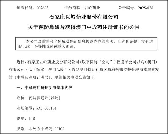 首個(gè)澳門注冊(cè)上市創(chuàng)新中藥!以嶺藥業(yè)芪防鼻通片添“新身份”