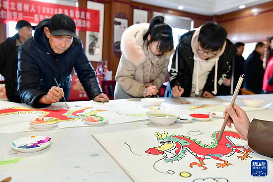 1月24日,在山東省樂陵市朱集鎮(zhèn)文化站,農民畫畫師在創(chuàng)作龍年年畫。 當日,山東省樂陵市組織農民畫畫師、剪紙老師、書法老師等文藝志愿者來到朱集鎮(zhèn),創(chuàng)作“龍”元素賀歲作品,迎接農歷龍年的到來,為群眾送上新春祝福。[