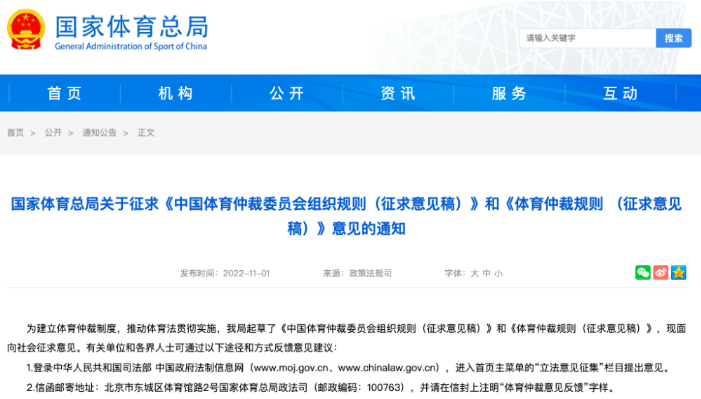 國家體育總局1日在官方網(wǎng)站上發(fā)文,就《中國體育仲裁委員會組織規(guī)則(征求意見稿)》和《體育仲裁規(guī)則(征求意見稿)》向社會公開征求意見。[
