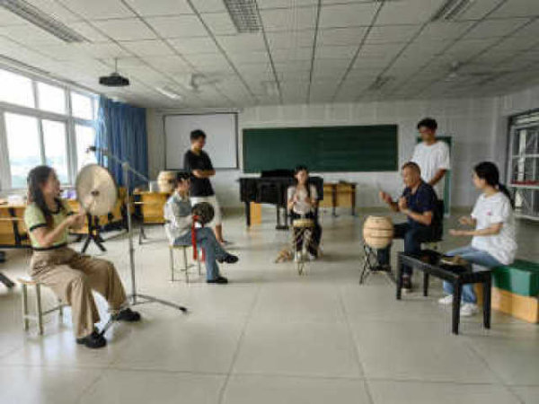 “現(xiàn)在我們開始新學期的第一課,同學們先來復習下上學期學習的內(nèi)容?!睅滋烨暗囊粋€下午,在綿陽師范學院音樂與表演藝術學院音樂樓五樓一間教室里,綿陽市非遺中心鼓師趙強以傳統(tǒng)音樂傳承班教師的身份,開始了新學期的第一次授課。 [
