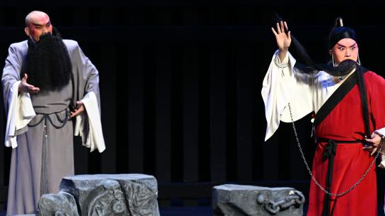1月19日,青年顧炎武飾演者楊陽(yáng)(右)在演出中。當(dāng)日,作為“相約北京·遇見(jiàn)江南”蘇州文化藝術(shù)展示周精品展演劇目之一,原創(chuàng)昆劇《顧炎武》在北京天橋劇場(chǎng)上演。[