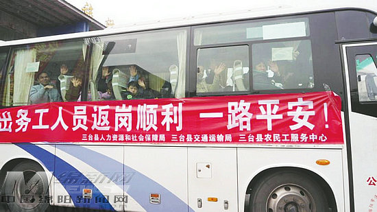 2月19日,在三臺(tái)縣旅游車站,5輛貼著“外出務(wù)工人員返崗專車”條幅的客運(yùn)車整裝待發(fā),老鄉(xiāng)們?cè)诂F(xiàn)場(chǎng)工作人員的指引下陸續(xù)登車。 “回家過年的時(shí)候,就專門有客車接我們;今天回去上班,又有送我們返崗的專車。這個(gè)服務(wù)太好了!”外出務(wù)工的劉長柏說。 [