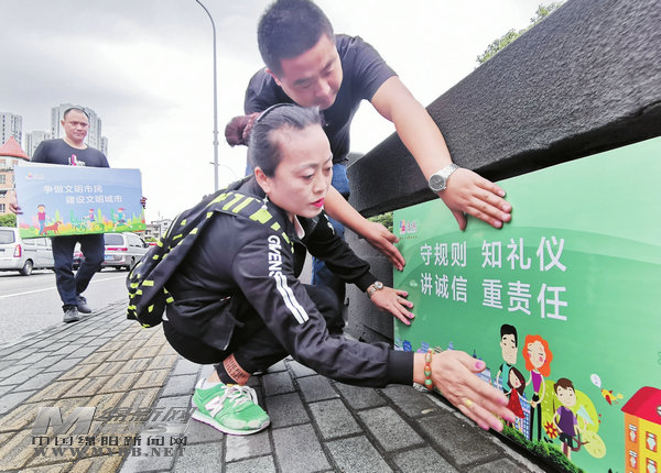近日,在長虹大道南段人行步道兩旁,涪城區(qū)石塘街道工作人員在張貼文明城市公益廣告。 [