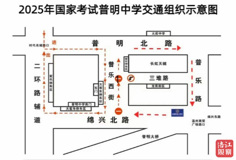 (二)接送考生等車輛,由普明北路與火炬西街交叉路口至普明北路與火炬東街交叉路口方向單向通行,(普明北路百捷利路口進(jìn),普明北路拾階公館路口出),在考點門口即停即走。同時火炬西街、火炬東街沿線禁止停車,普明南路及普明北路遠(yuǎn)端可雙向單排停放車輛,鉑金時代地下停車場可停放車輛。(如遇臨時交通管制措施聽從現(xiàn)場交警指揮)