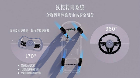 憑借線控轉(zhuǎn)向技術(shù),梅賽德斯-奔馳實現(xiàn)了全新轉(zhuǎn)向體驗與至高安全的結(jié)合。對于Vision Iconic概念車這類較長的車型,該技術(shù)的優(yōu)勢愈發(fā)凸顯,特別是在搭配后輪主動轉(zhuǎn)向系統(tǒng)后,既可以大幅提升操控性,也能讓機動性與泊車便利性顯著提高。這是因為線控轉(zhuǎn)向可進一步降低轉(zhuǎn)向力度,并且在泊車時不需要反復(fù)抓握方向盤。該技術(shù)無需在方向盤與前輪之間建立機械連接,駕駛員的轉(zhuǎn)向請求可通過控制單元與執(zhí)行器快速、直接地傳遞給車輪。