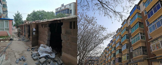 錦州市五里營子小區(qū)在“老舊小區(qū)”改造前后對比圖。(左圖為小區(qū)改造之前的違章建筑,2020年7月16日攝;右圖為改造后的小區(qū)樓房外觀,2021年11月17日攝)新華社記者 楊青攝