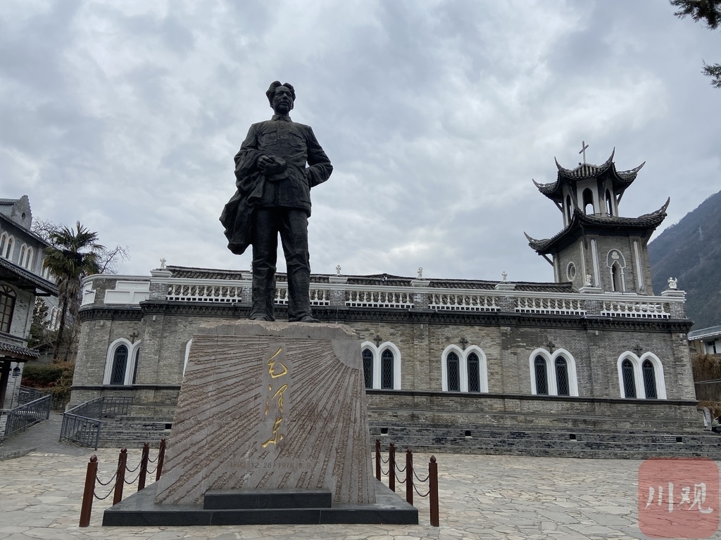 磨西鎮(zhèn)上,有一座中西合璧的天主教堂,1935年5月29日晚,經過連續(xù)三天行軍的毛澤東隨軍團隊伍到達磨西,宿營磨西天主教堂神甫樓。