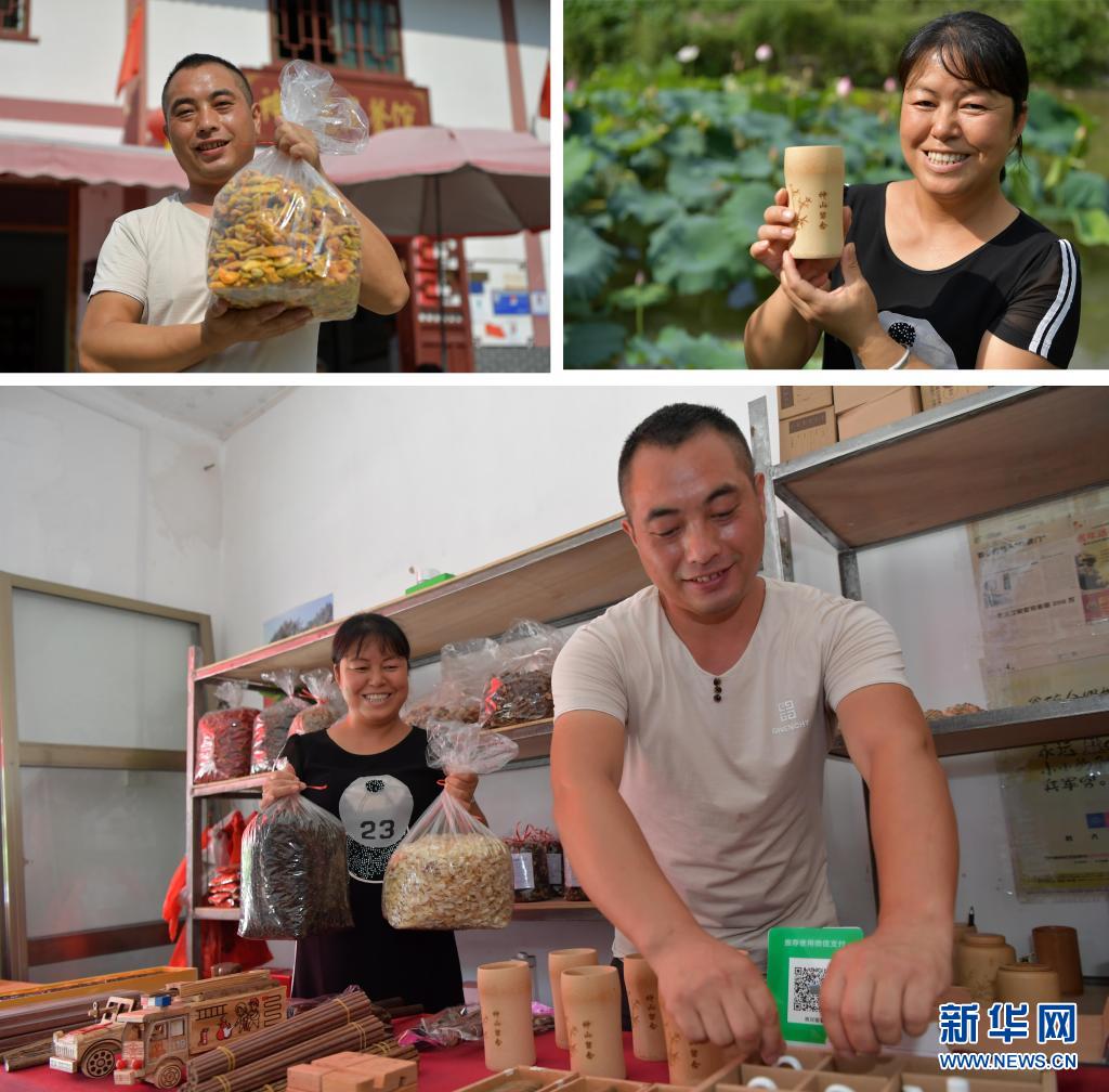 這是一張拼版照片,左上圖為:井岡山神山村村民左良建展示自家開辦的土特產(chǎn)商店銷售的神山土產(chǎn)(2020年7月15日攝);右上圖為:神山村村民張麗萍展示自家開辦的土特產(chǎn)商店銷售的神山紀念品(2020年7月15日攝);下圖為:神山村村民左良建、張麗萍夫妻在自家開辦的土特產(chǎn)商店整理商品(2020年7月15日攝)。新華社記者 彭昭之 攝