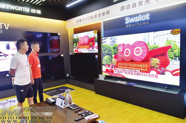 在我市一家商場(chǎng)的電視銷(xiāo)售專(zhuān)柜,市民在駐足觀看慶祝中國(guó)共產(chǎn)黨成立100周年大會(huì)直播盛況(綿陽(yáng)日?qǐng)?bào)社融媒體記者王勇攝)