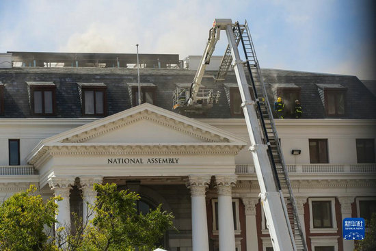1月2日,消防員在南非開(kāi)普敦的議會(huì)建筑起火現(xiàn)場(chǎng)工作。新華社發(fā)(哈比索·姆卡貝拉 攝)