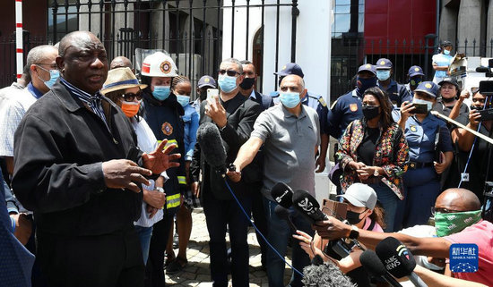 1月2日,南非總統(tǒng)拉馬福薩(前左)在開(kāi)普敦的議會(huì)外向媒體說(shuō)明火災(zāi)情況。新華社發(fā)(哈比索·姆卡貝拉 攝)