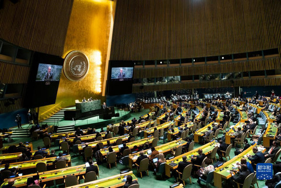 這是2月28日在位于紐約的聯(lián)合國總部拍攝的聯(lián)合國大會就烏克蘭局勢召開的緊急特別會議現(xiàn)場?!⌒氯A社記者王迎攝