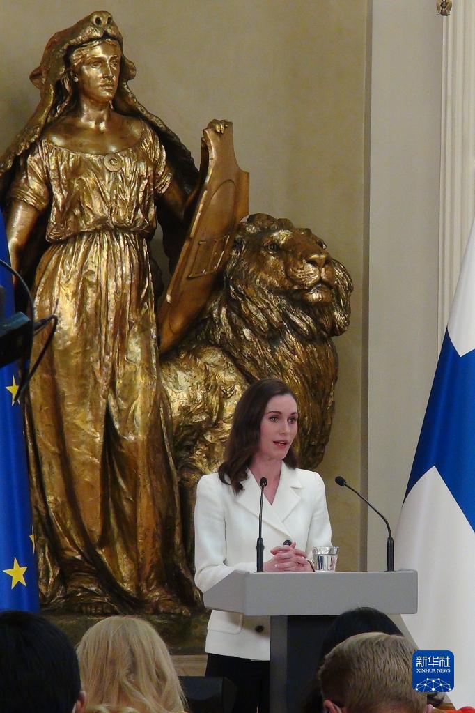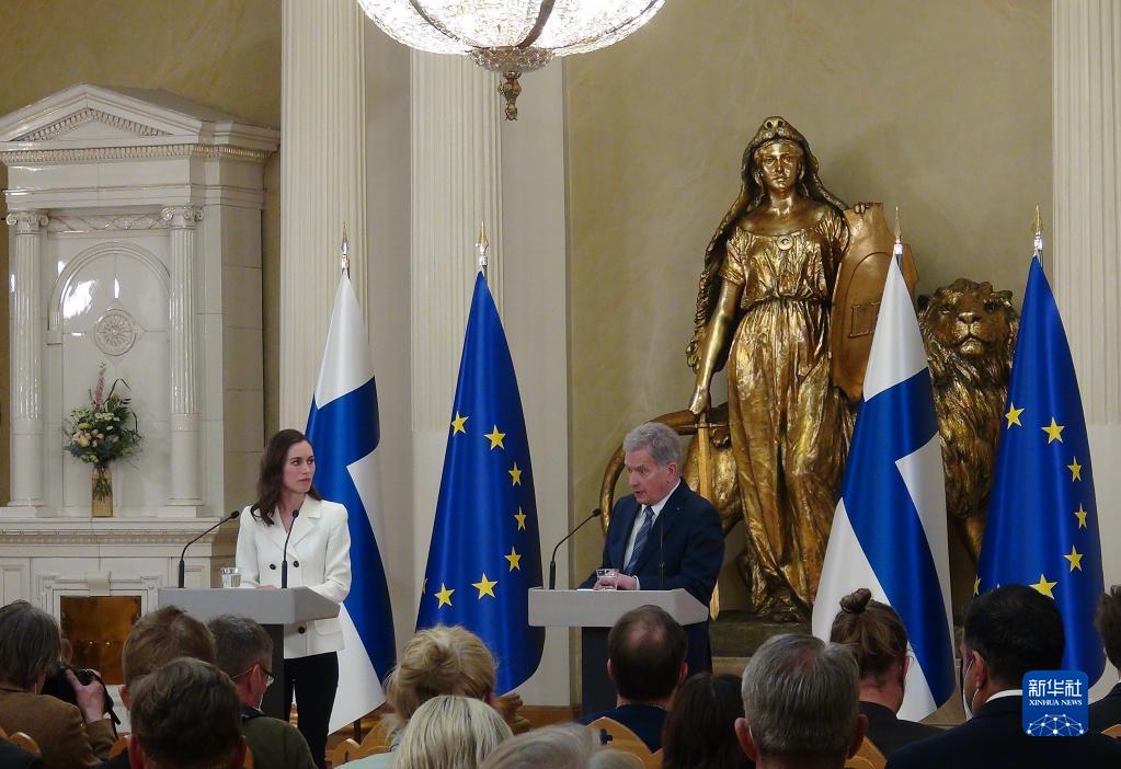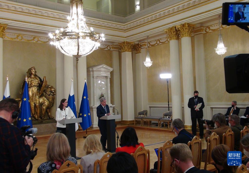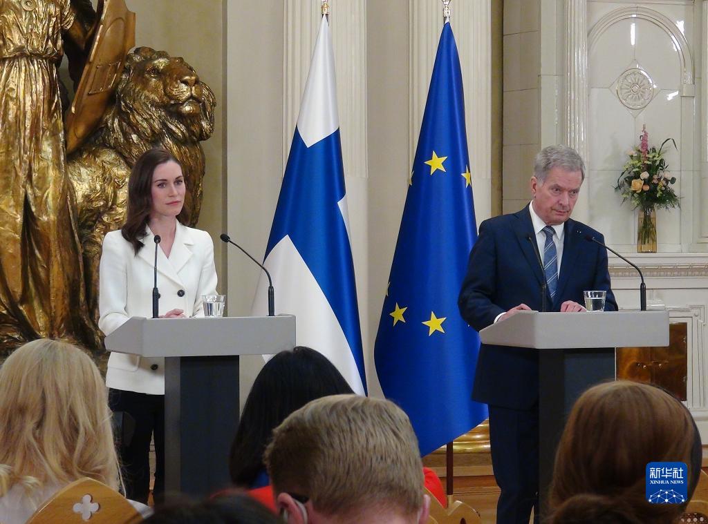 5月15日,在芬蘭赫爾辛基,芬蘭總理馬林和總統(tǒng)尼尼斯托(未在畫面中)參加聯(lián)合記者會。新華社記者 陳靜 攝